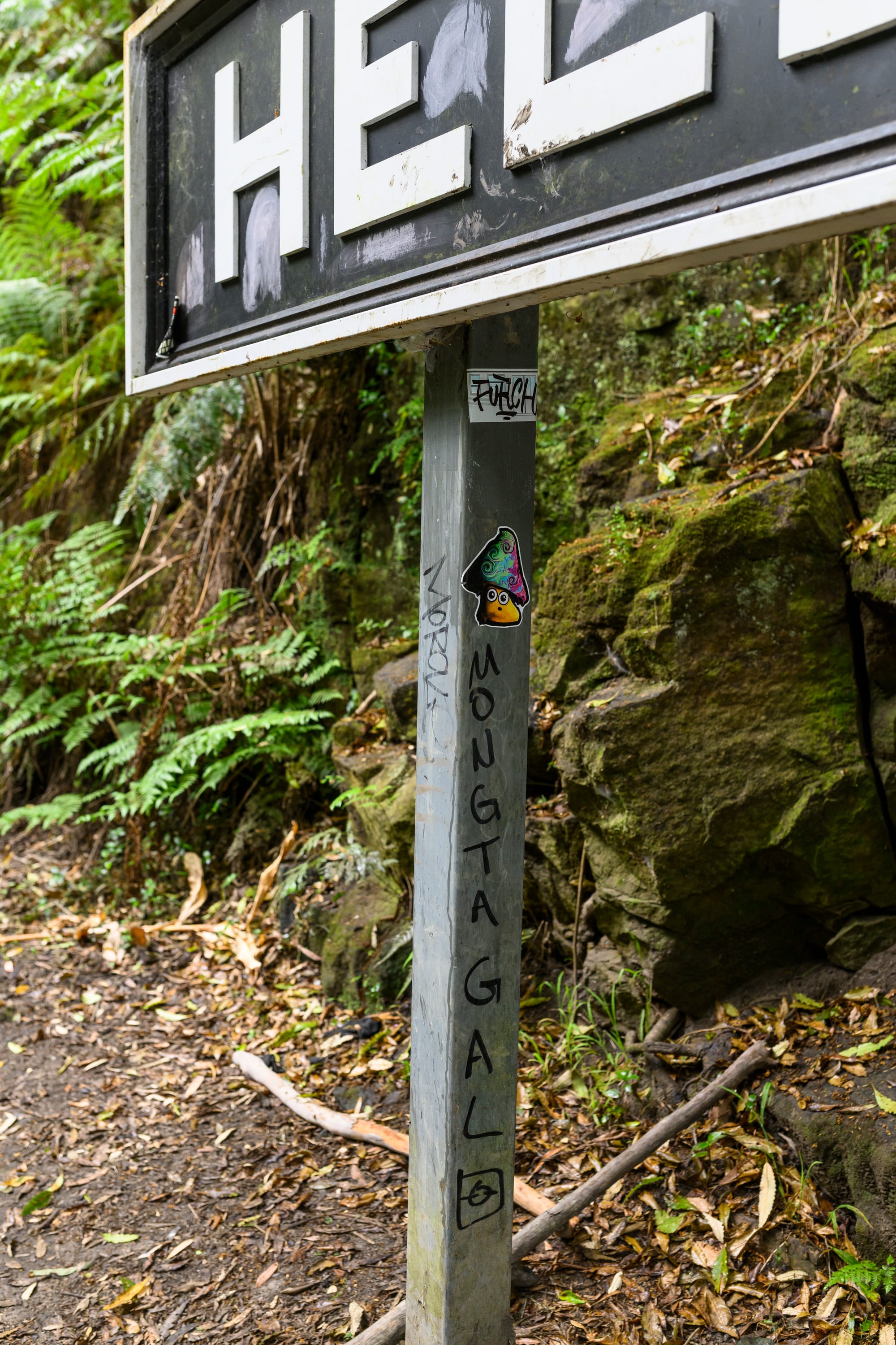 Merilyn inspects a patch of wandering trad. At right: graffiti marks the old station sign replica. Photos: Anthony Warry