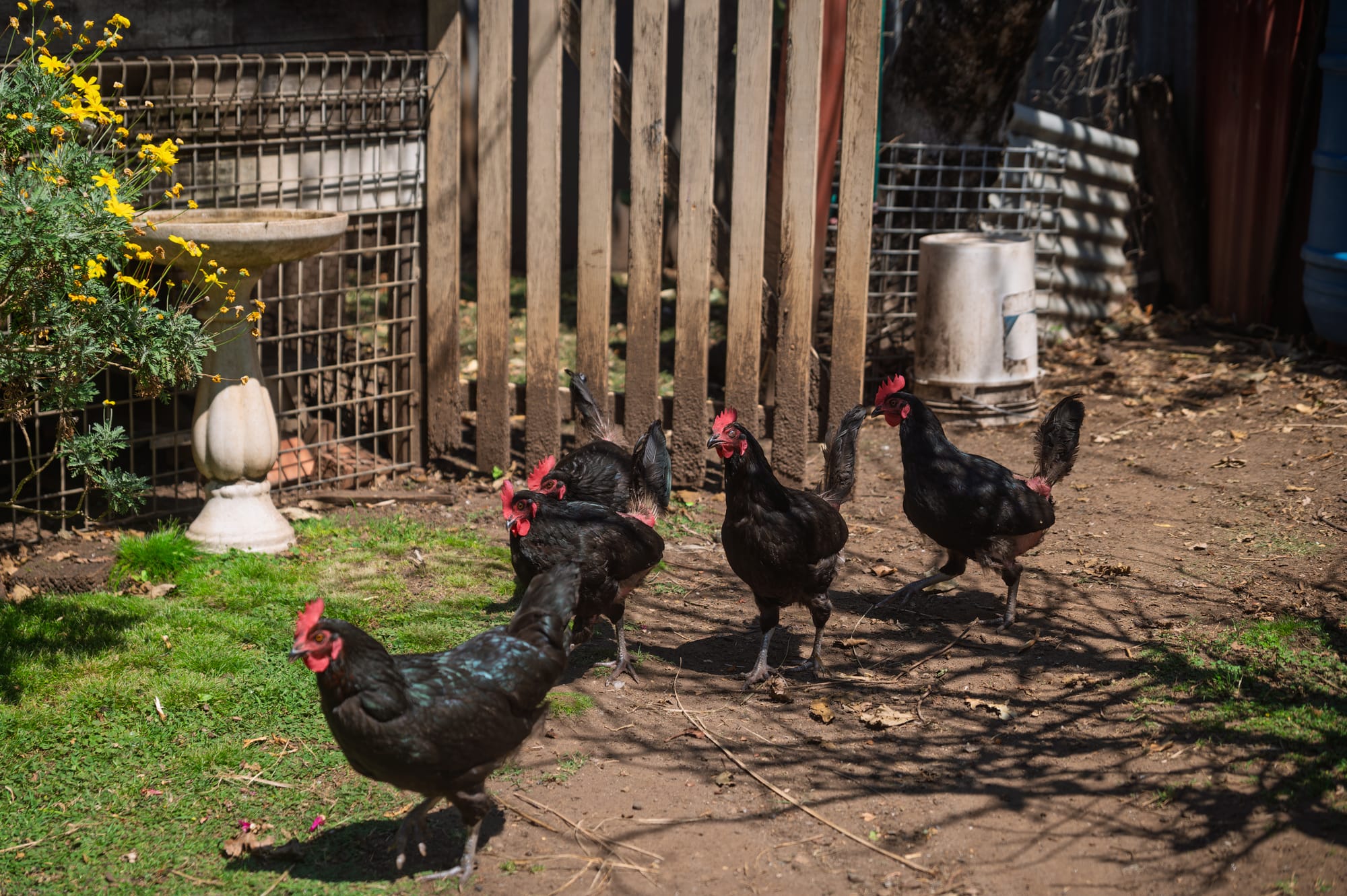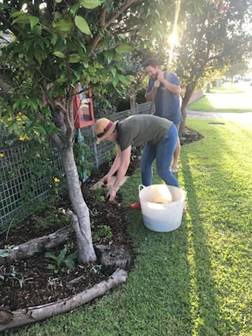 One neighbour, Brad, drops off bags of coffee grounds from Xavier's cafe in Fairy Meadow for Brian and Lisa to use in their compost and gardens. Brad also drops off his scraps to feed the chickens, and enjoys their eggs in return.