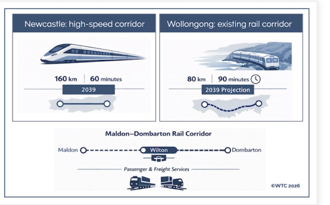 Dr Laird says the combination of a booming population in south-western Sydney, combined with big numbers of people arriving at the new airport, means the Maldon-Dombarton line should also be capable of moving large numbers of passengers, also requiring a new train station to be built at Wilton.