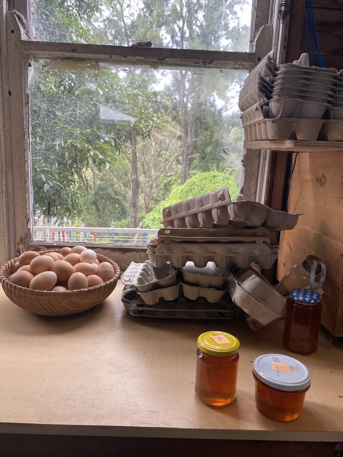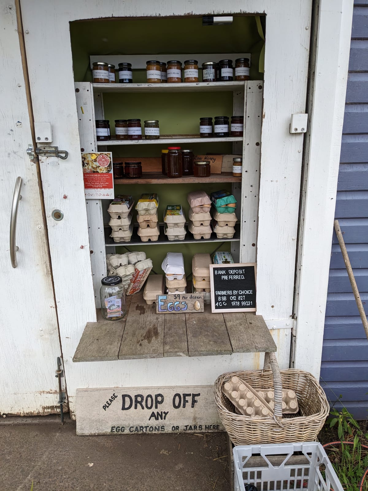 The farmgate, alongside the local honey and eggs, supports other local producers as well, with jams, chutney, chilli oil and seedlings on offer. There is an honesty system for cash payment or the option for payment via bank transfer. Luke encourages people to drop off jars and egg cartons for reuse.