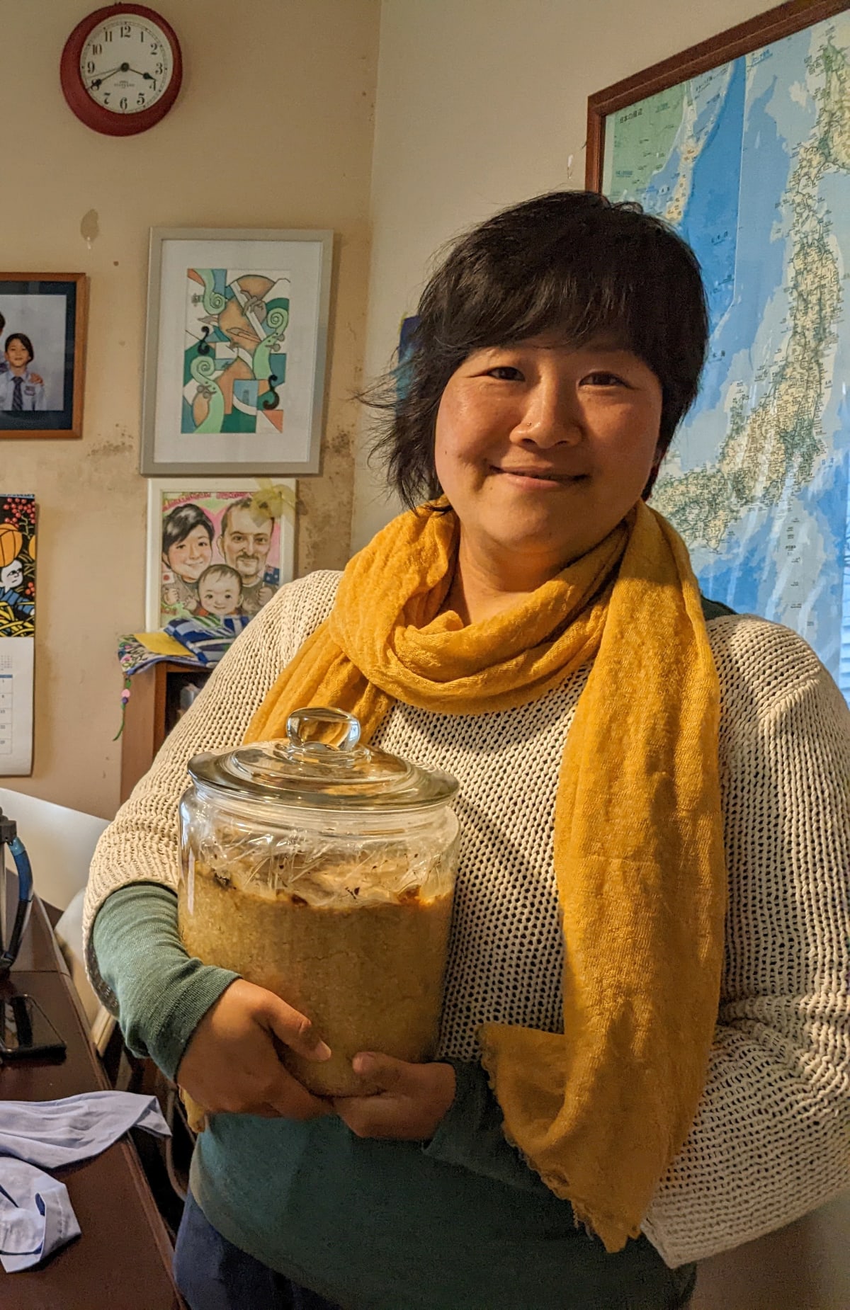 Manami makes her own miso, a fermented paste, and also teaches this skill to others. With a very long period of fermentation, the whole process often takes six months. She makes a large batch, which is used sparingly in dishes due to its intense flavour. She showed me the two batches that she is currently nurturing – one a soy bean base and the other a lentil base. Chickpeas can also be used. Regardless of the medium, it is inoculated with koji (a type of mould) and left in a warm place to work its magic.