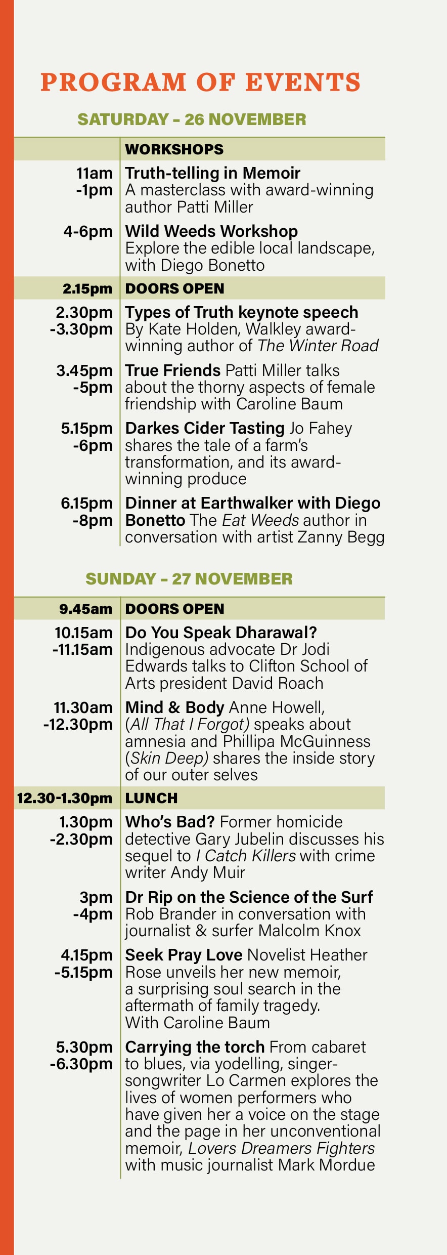 At Coledale hall on 26 & 27 November, the festival of true stories is a co-production of the South Coast Writers Centre and the Flame, with artistic direction by Caroline Baum.