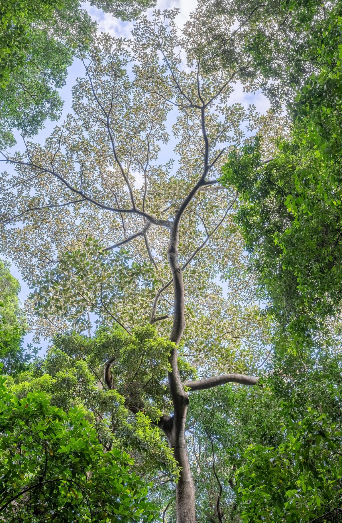 In their natural rainforest habitat, Moreton Bay Figs typically grow as strangler figs, starting life as tiny seedlings high in the canopy, in the fork of an established tree. It can take many years for their roots to descend to the ground, but once the roots are in soil the fig really takes off, growing quickly and squeezing the life out of the host tree. A notorious specimen is visible in the Illawarra Rhododendron and Rainforest Garden, where it's busy trying to strangle another enormous fig tree, a Small-leaved Fig (Ficus obliqua). It remains to be seen which tree will prevail.