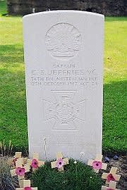 On the 21 December 1917 Captain Clarence Smith Jeffries was posthumously awarded the Victoria Cross after an act of gallantry at Passchendaele (Ypres Phase 5) in Belgium. He organised a party of men under machine-gun fire that successfully captured four machine guns and took 35 prisoners; again his group successfully disengaged further machine guns and he was killed in the engagement. He is buried in Tyne Cot Cemetery, Belgium, plot XL.E.1.