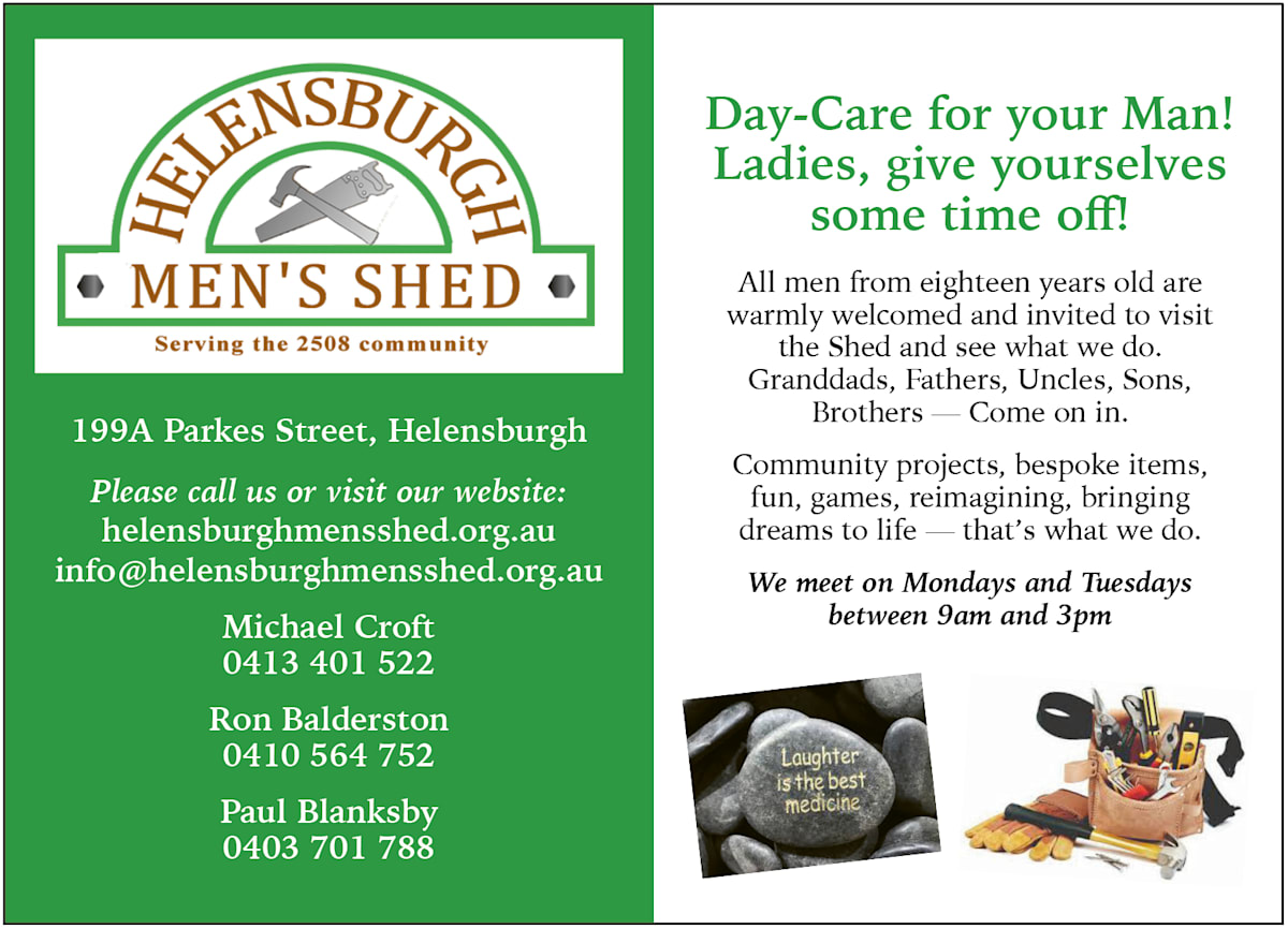 We are open to men from 18 and up. Pop in and have a chat, enjoy one of Rosie’s lovely ‘Morning Brews’. Visit helensburghmensshed.org.au; 199A Parkes St, Helensburgh, 9am-3pm Mon & Tues; Michael Croft 0413 401 522; Ron Balderston 0410 564 752; Paul Blanksby 0403 701 788.