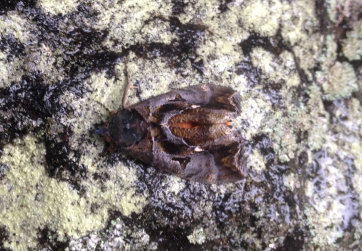 The other moth I found on the station is much larger but also cryptic, pretending to be a rolled-up leaf. However, this one is modestly covering up – underneath the hind wings are deep yellow. While a beautiful moth, the occurrence of this species locally might send alarm bells to our local orchards.