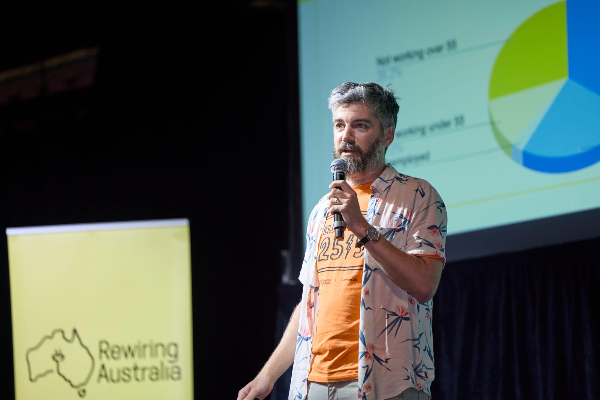 Rewiring Australia CEO Francis Vierboom and Energy Futures Network Director Ty Christopher speaking at the Go Electric Open Day at Club Thirroul in June. Photos: Jeremy Park/Rewiring Australia