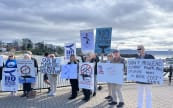 While WIN News and national TV crews filmed the scene, the group chanted “No wind turbines” and displayed signs reading “Save the planet, does not mean destroy the ocean” and “No coastal wind factory Illawarra”.