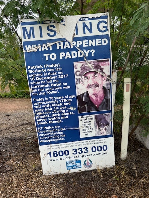 Signs along the Stuart Highway and at the pub are still seeking public assistance to find Paddy’s killer. One of those signs is on the fence outside Paddy’s humble home (now vacant), which has been listed for sale, having been held by the NT’s Public Trustee since Paddy’s disappearance. An onsite auction date has been set for 7 May 2024.