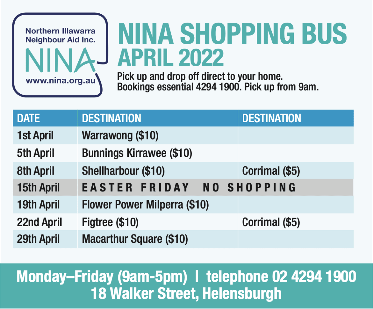 NINA is a local not-for-profit organisation dedicated to serving our senior citizens. Our offices are opposite Helensburgh Coles at 18 Walker Street. Call (02) 4294 1900 or follow @northernillawarraneighbouraid on Facebook.