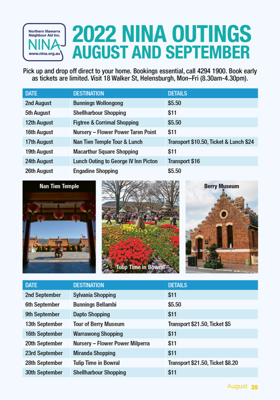 Pick up and drop off direct to your home. Bookings essential, call 4294 1900. Book early as tickets are limited. Visit NINA's office at 18 Walker St, Helensburgh, Mon–Fri (8.30am-4.30pm)