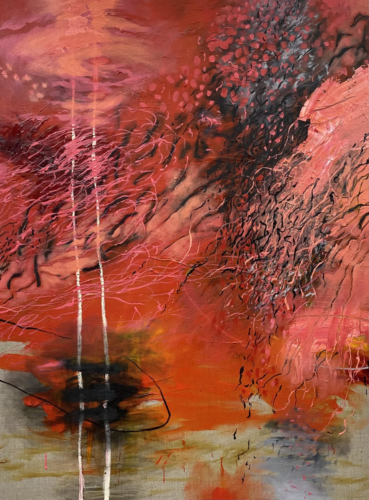 This work, she says, “depicts my reaction to our sea shore turning red and filthy through soil run-off from a significant local housing development above the rock platform. The density of the mud turned the sea abnormally red and though the ocean still had its power and beauty, it had been damaged by careless human development. I was honouring the sea by making this painting while acknowledging what was happening in our area.”