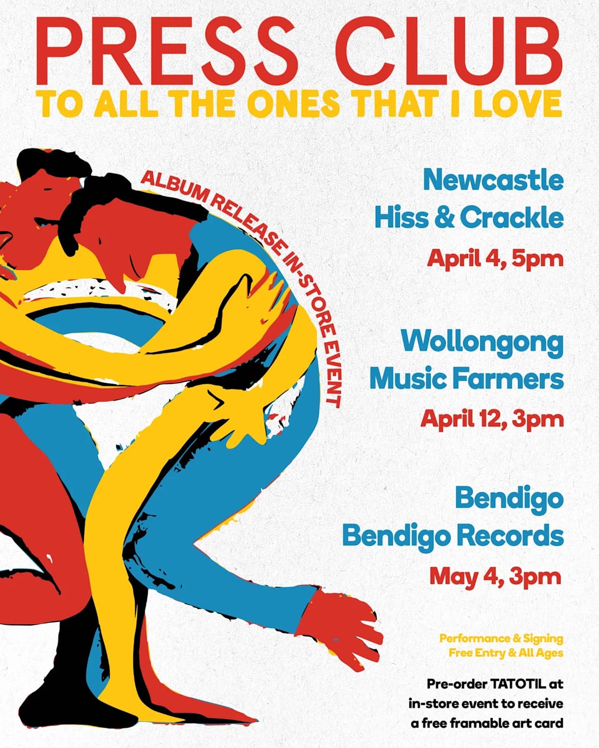 Press Club will host a show at Music Farmers in Wollongong from 3pm to celebrate the release of their fourth album (available from May 2), then they will perform at The Iron Yampi from 7.30pm as part of the Port Kembla Festival.