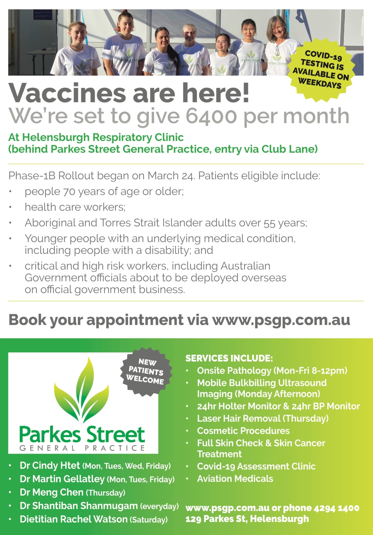 Helensburgh Respiratory Clinic, a government-funded, GP-led initiative, opened on 11 May 2020 in a temporary building behind Parkes St Practice.