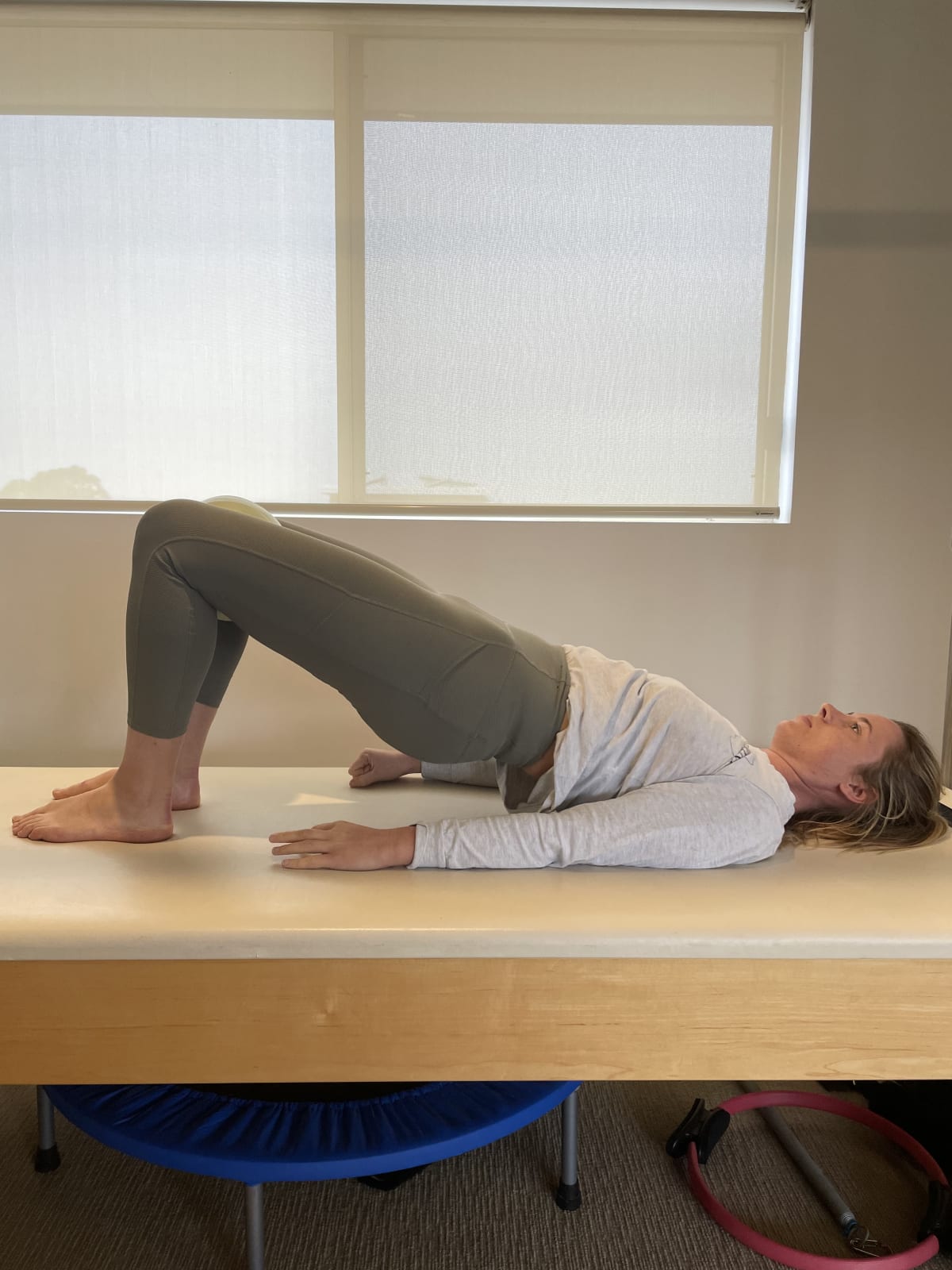 Lie on your back with your knees bent, feet flat and a cushion or ball between your knees. As you squeeze the ball with your knees, squeeze and lift your pelvic floor. Tip your hips back so your lower back presses into the ground. Start to push through your feet to lift your hips up. Roll back down through the spine one vertebrae at a time.