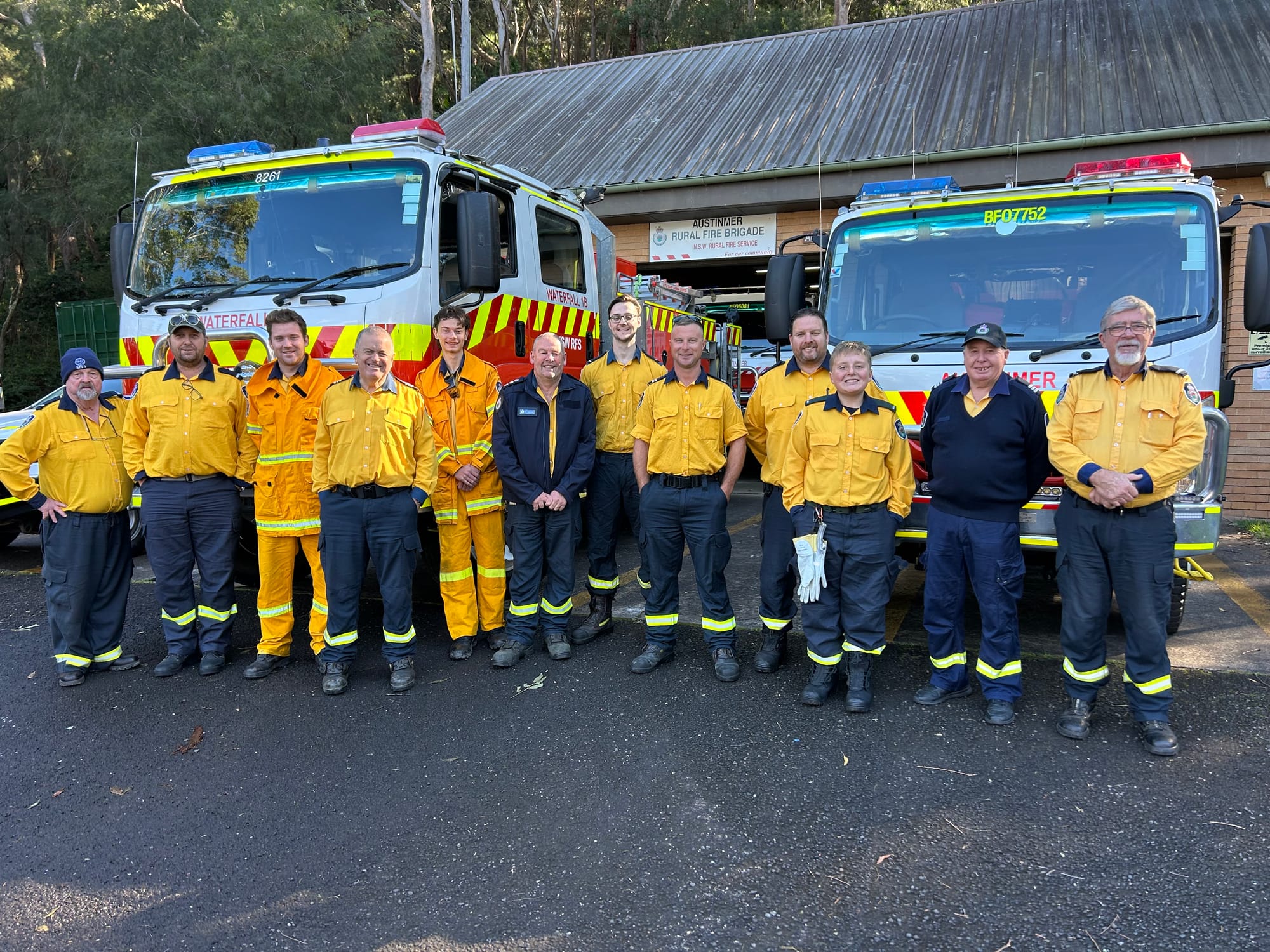 NSW RFS Group Captain of Illawarra/Sutherland, Craig Robertson AFSM (Australian Fire Service Medal, 2015) and a crew at Austinmer fire station. Photos: Anthony Warry & Jeremy Lasek
