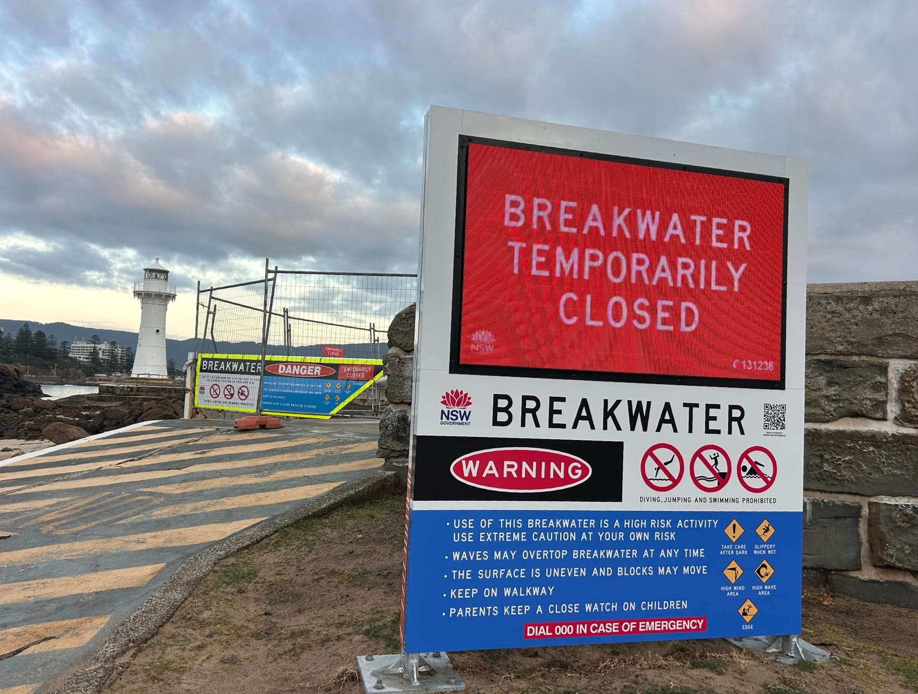 Meanwhile, in an early response to the New Year’s Eve drama in Wollongong, the NSW Government has installed new signage advising people of the temporary closure of the dangerous breakwall.