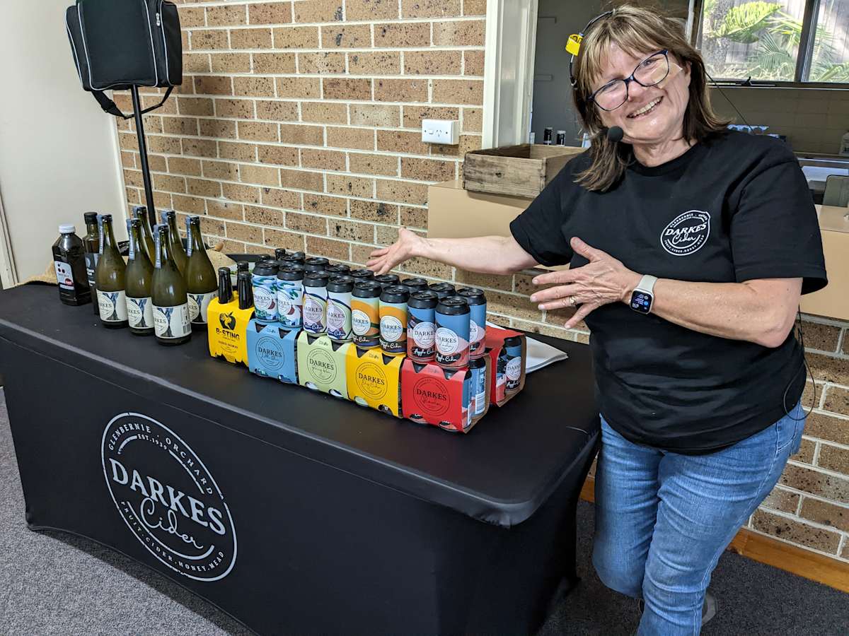 We tasted several ciders from dry to medium sweet, the non-alcoholic Little Blue, the Perry (the name for pear cider) and B-Sting (honey mead). Jo taught us how to “rouse” or mix the dry Hermitage so that the sediment became part of the drink, improving mouthfeel. We were invited to make additions of mint, lime, cherry juice or apple cider vinegar. We were warned of the dangers of drinking too much Perry owing to the presence of the unfermented sugar sorbitol possibly causing digestion issues. Each can contains the equivalent of at least four pears. The apples for all the Darkes ciders are grown on the farm, and Glenbernie swaps apples for pears with a pear orchard in Orange to make the Perry.