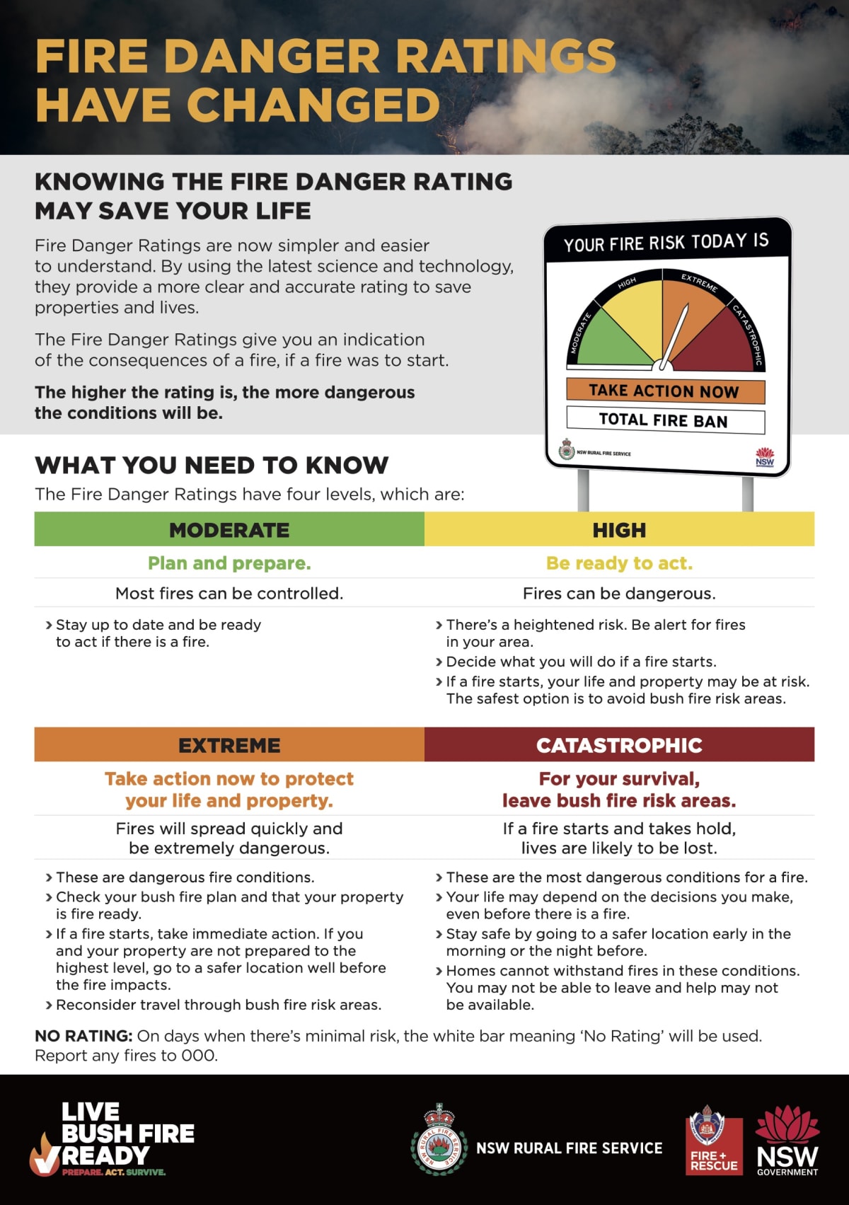 - Catastrophic rating: Means for your survival leave bushfire risk areas. If a fire takes hold, lives are likely to be lost.