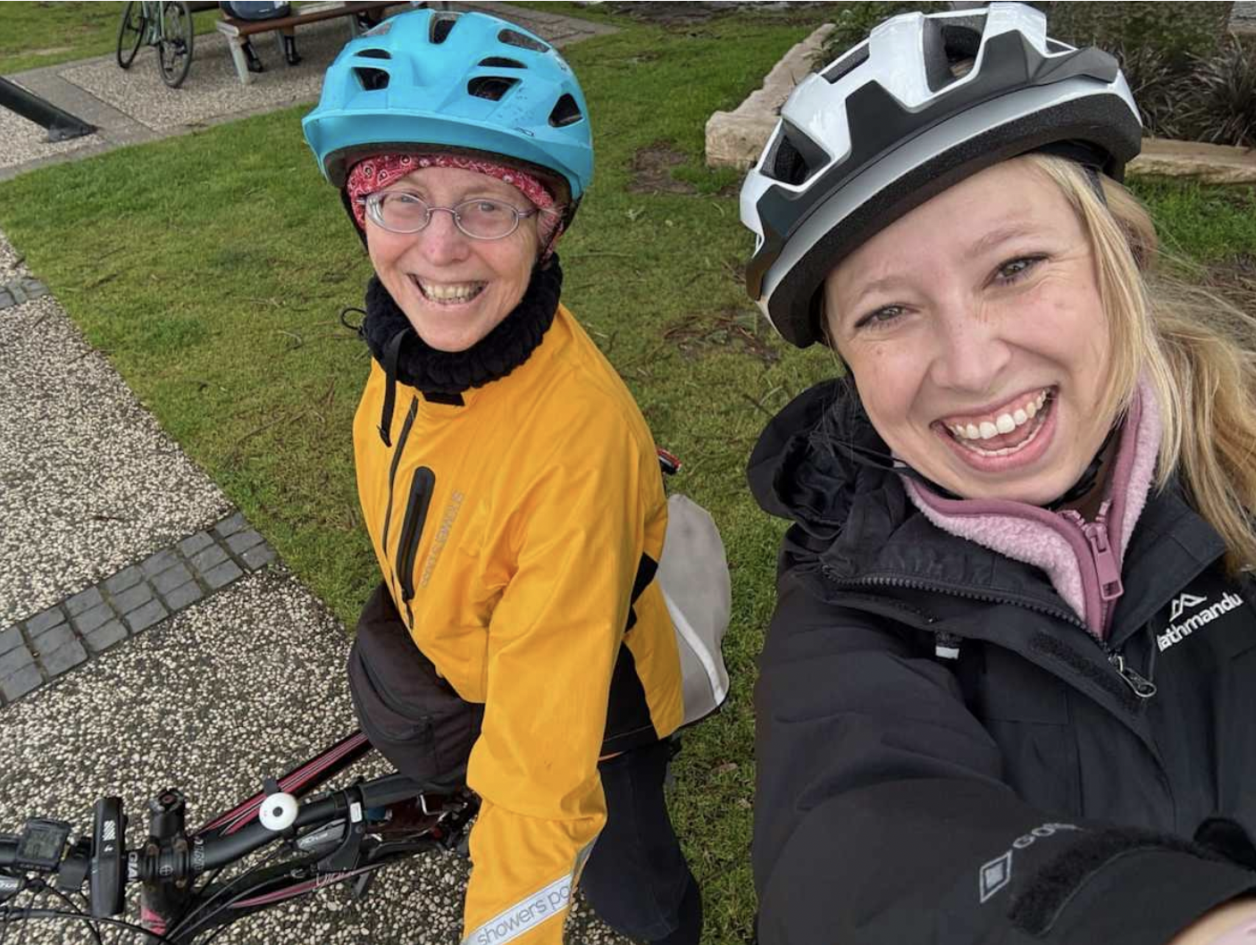 L to R: Healthy Cities staff cycling through Figtree on Ride to Work Day, and Marie (at left) and Kaitlyn, the first pair of buddies connected by the Illawarra Bicycle Users Group's new Bike Buddies program. Photos supplied