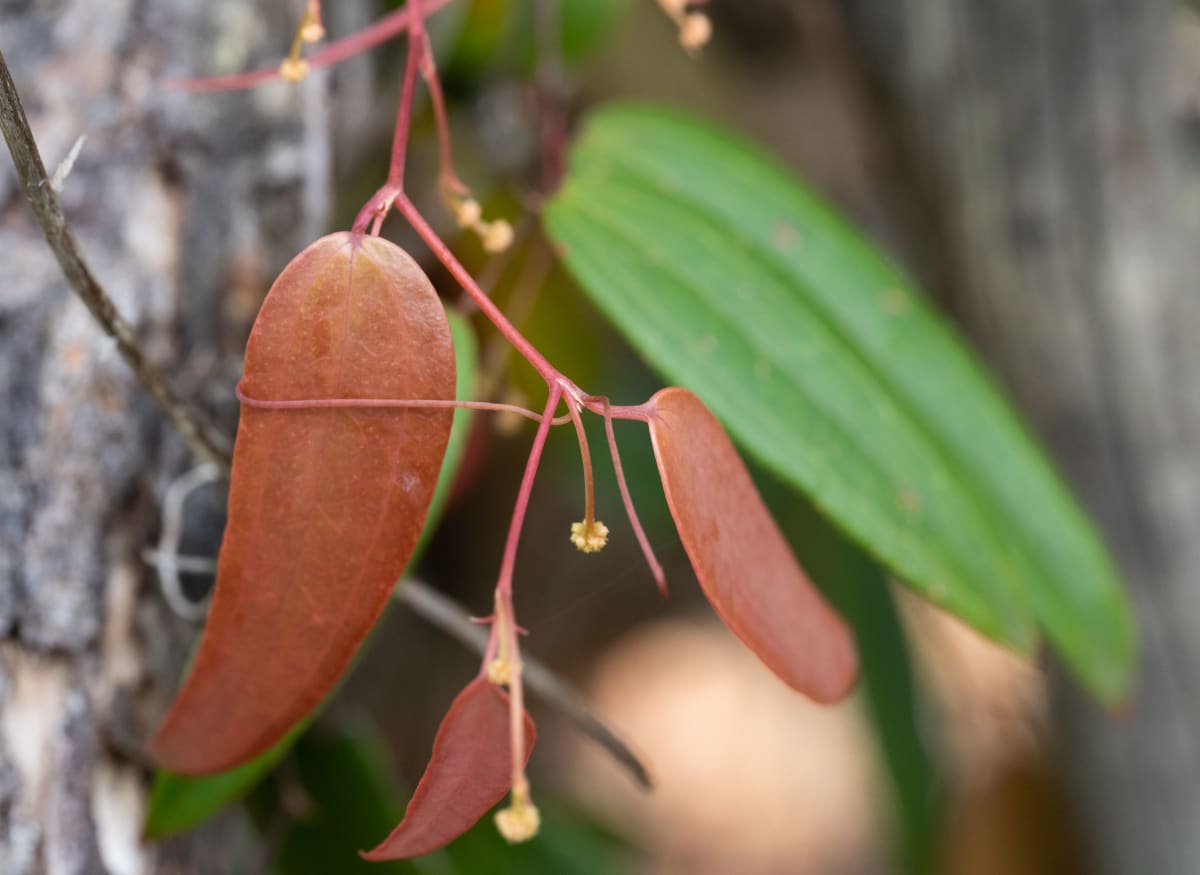 As well as being beautiful, the young leaves are also edible and quite yummy, though please respect plants growing in natural areas and reserves, preferably by buying and cultivating one of these vines yourself – they do well in pots and will add colour whenever they put on a flush of new leaves.