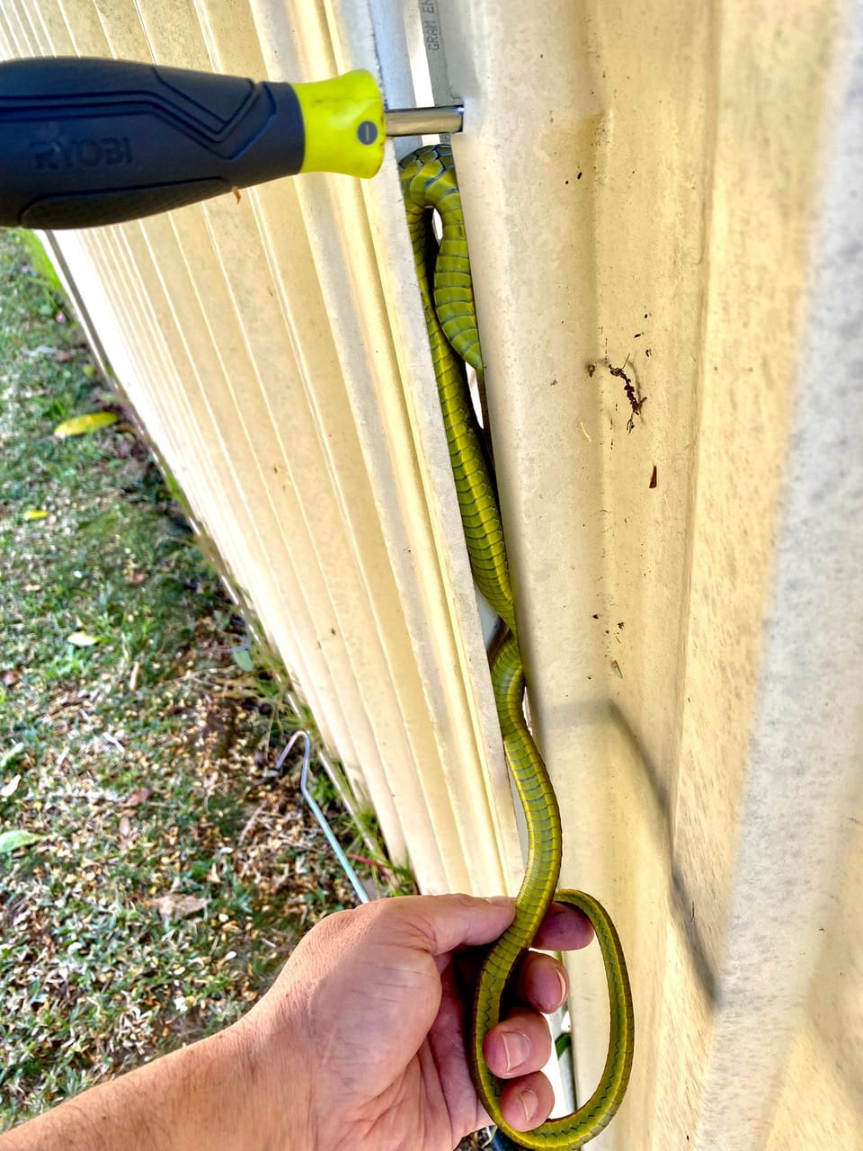 Green Tree Snake trapped in corrugated iron fencing. Photo: WIRES