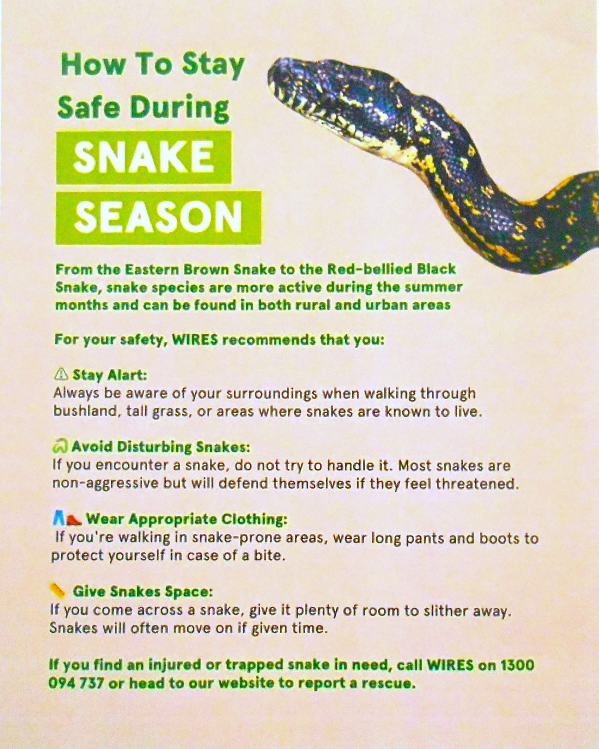 Being aware of snakes is part of living in Australia. It is important to know that if you stay well away from them, they will not harm you. Australian snakes are not naturally aggressive and only attack if provoked.