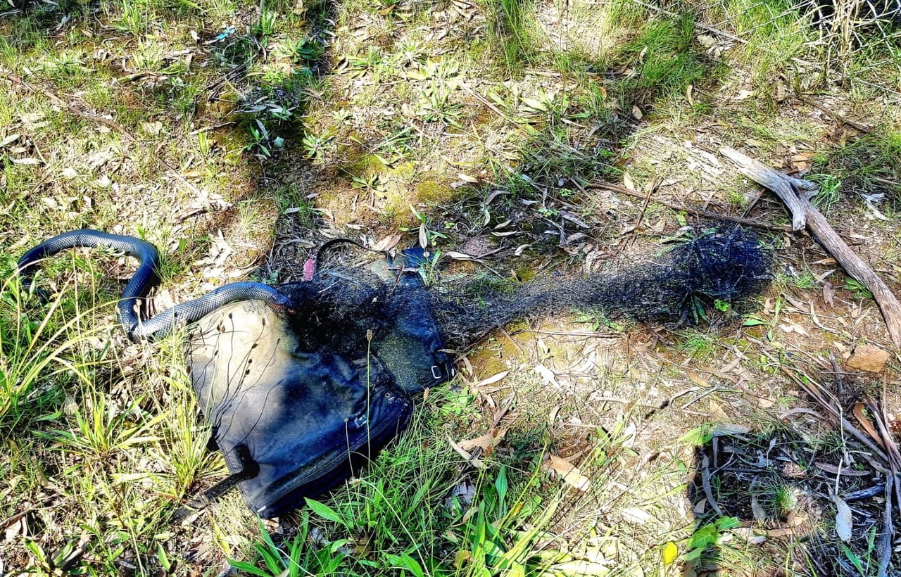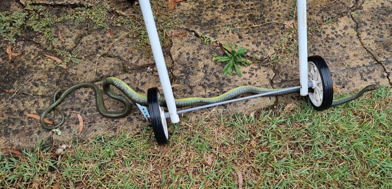 Green Tree Snake trapped in wheels of a laundry trolley. Right: Entangled Red-Bellied Black Snake rescued from discarded netting. Photos: WIRES