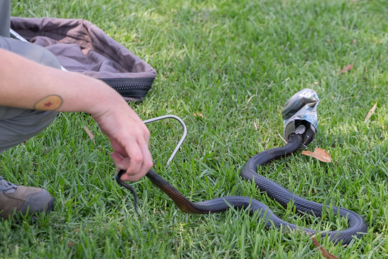 WIRES volunteer rescuing a Red-Bellied Black Snake with head trapped in a drink can. Photo: WIRES