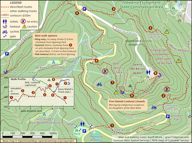 The track can be traversed in the easier clockwise direction or anticlockwise as described; the profile shows where the steep sections occur. Can extend to Robertson’s Lookout (2.5km return) or to the summit (experienced walkers only, 2.4km return).