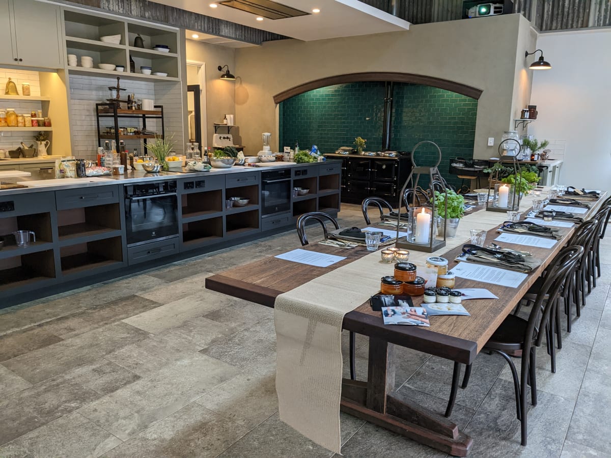 We are in awe of the beautiful space that is home to Moonacres School. A long island bench housing several cooktops and ovens takes centre stage. At one end is a tiled nook with a fuel stove that would warm the entire place should it be needed. Mirroring the length of the bench is a huge communal table, which we can tell is where we will be sampling the delights of the kitchen.