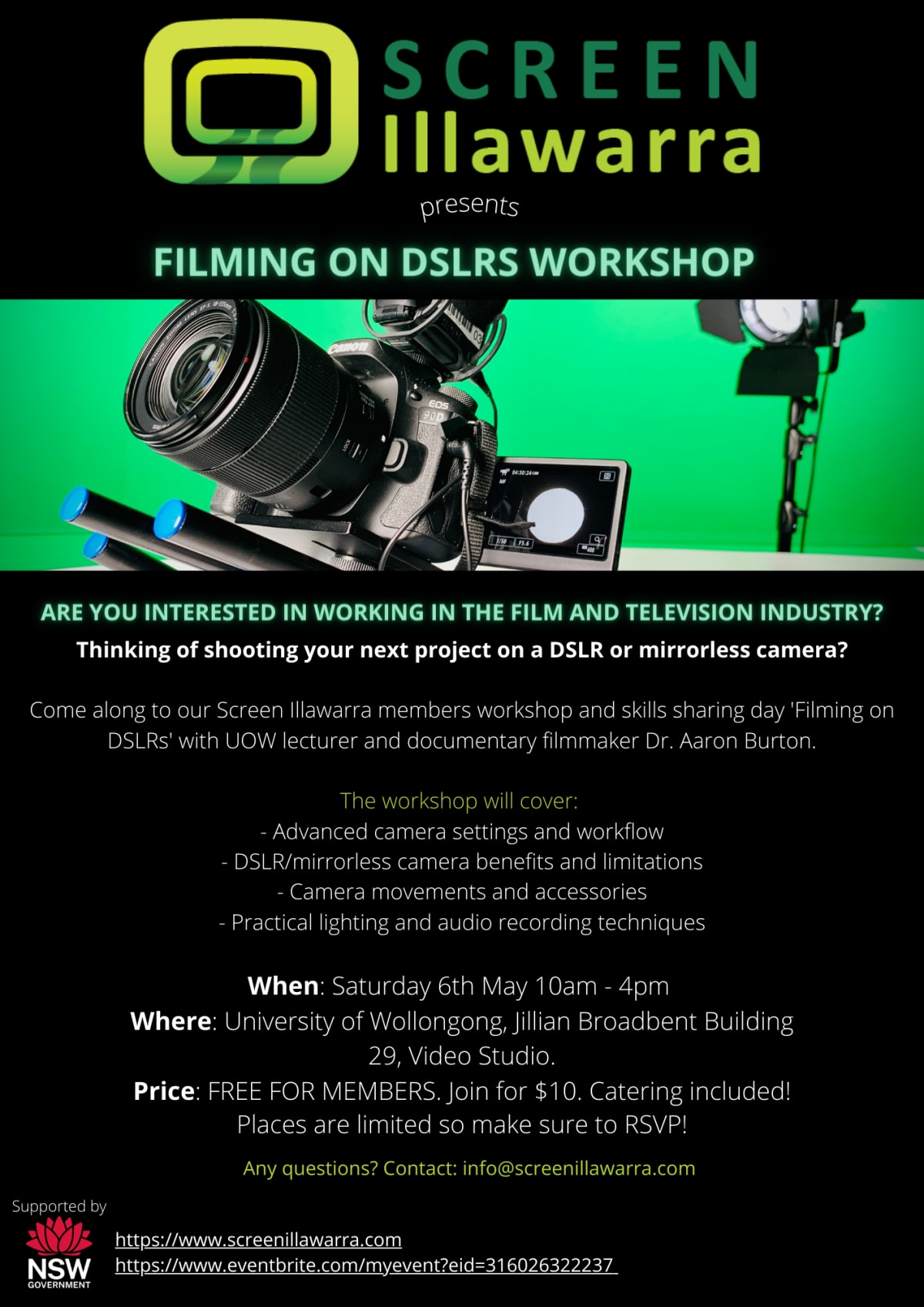 A new series of training workshops starts this month with Screen Illawarra board member Dr Aaron Burton, a documentary maker and University of Wollongong lecturer, holding a “Filming on DSLRs” workshop on Saturday, May 6.