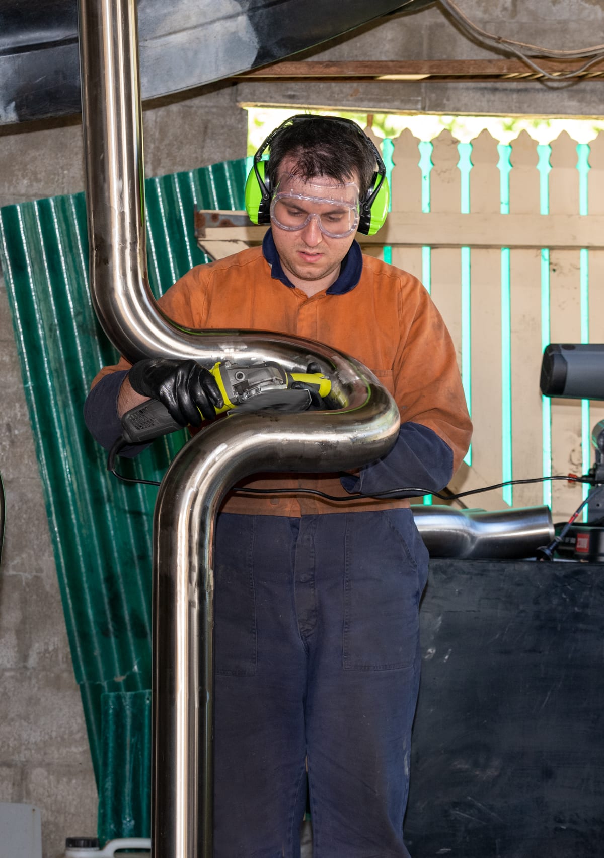 I fabricated the work by cutting muffler exhaust tubes to the intended length and welding them together using stainless steel arc welding. In some cases, I heated the joins to a hot enough temperature to bend the angles.The welds are ground back to produce a seamless form.