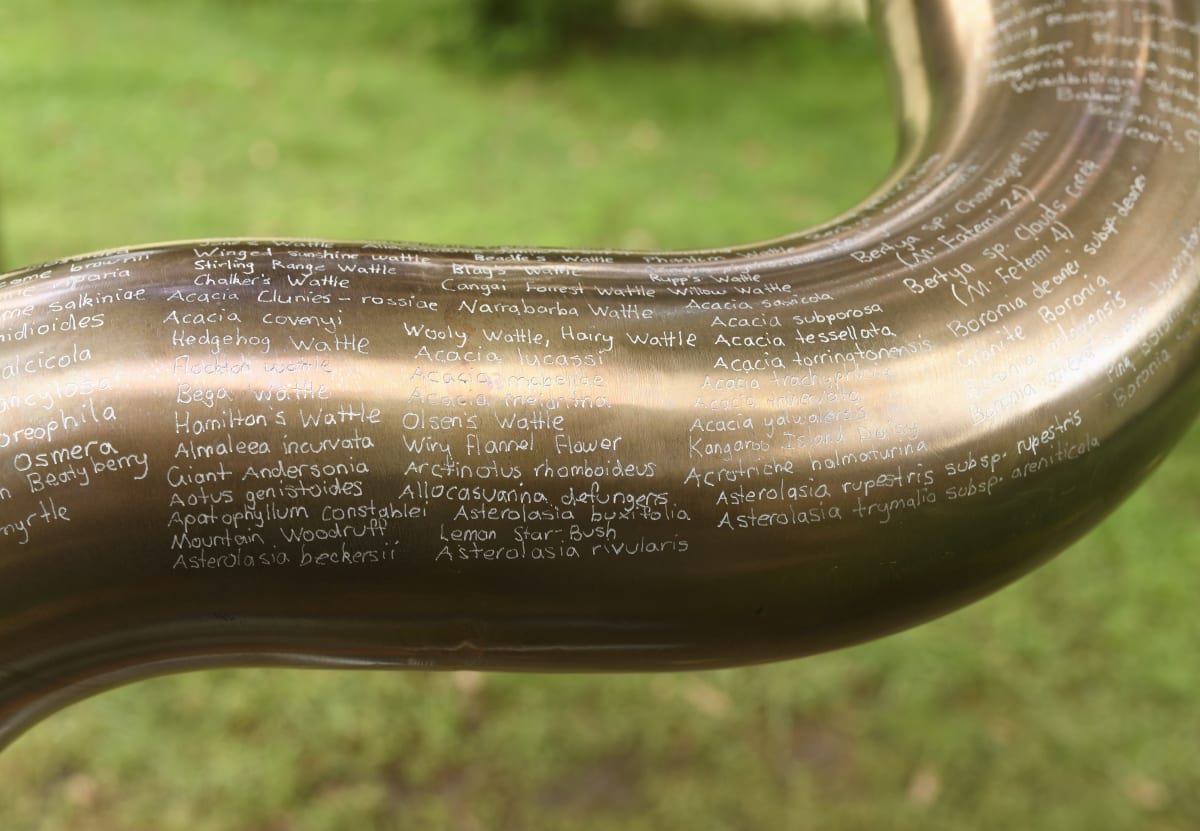 Six tree-like forms are fabricated of stainless-steel half-pipe exhaust tubes representing 5.8 million hectares of landscape burnt in NSW. The names of 119 threatened animal species, 486 threatened plant species, the 23 identified victims, 29 fire events and 219 towns affected are engraved onto each sculptural piece respectively.