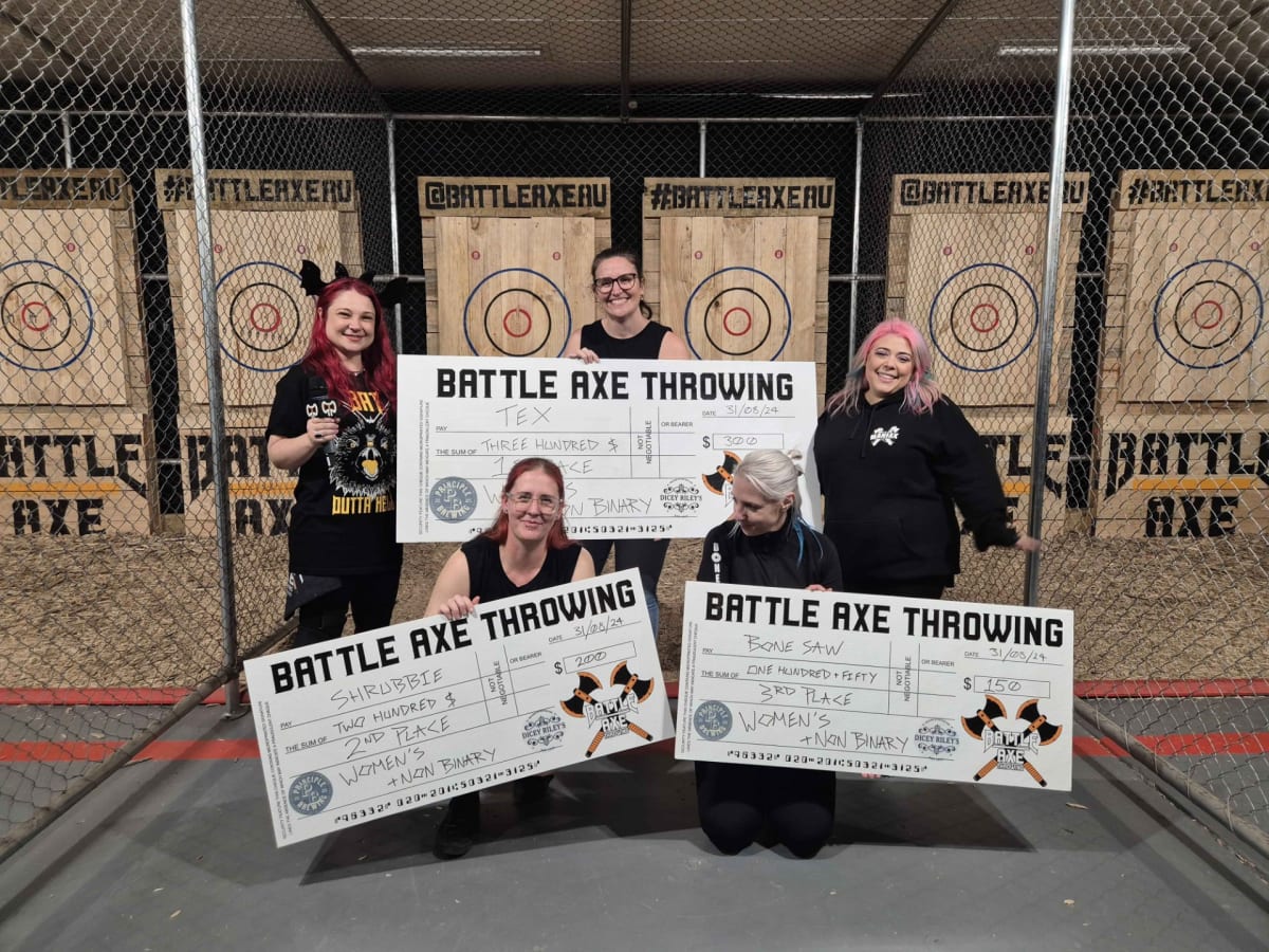The competition highlight was the Women’s and Non-Binary IATF Major Tournament, with Jenn Walker from Brisbane taking 1st place, followed by Clara Bush in 2nd, Eden Medway in 3rd, and Isabella Polizzi in 4th. Jenn will now go on to represent Australia in the 2025 International Axe Throwing Championships in Canada.