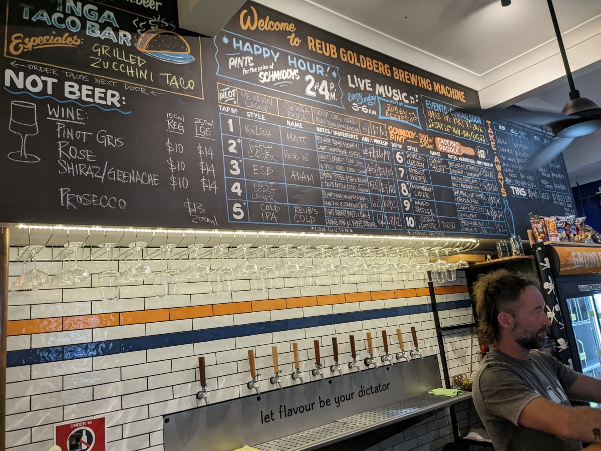 What eventuated was the Reub Goldberg Brewing Machine (RGBM), a brewery and venue that opened its doors in 2018. Owned and operated by life partners Billy and Anna (and their English staffy Kodah), the brewery teamed up with Gringa Taco Bar to offer great food alongside great beer.