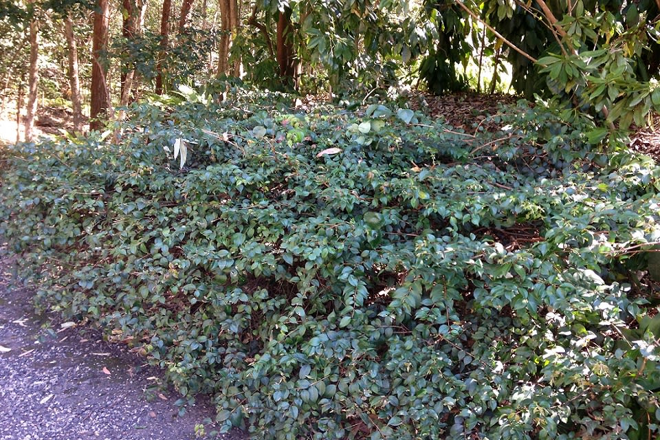 In the toughest spots, or alternatively where a human has taken the time to manage the growth form, Grey Myrtle can be seen as a fairly low, dense shrub. The below specimens are in the Illawarra Grevillea Park and Botanic Gardens in Bulli, where they've been pruned and trained to form a dense hedge about 1.2m high.
