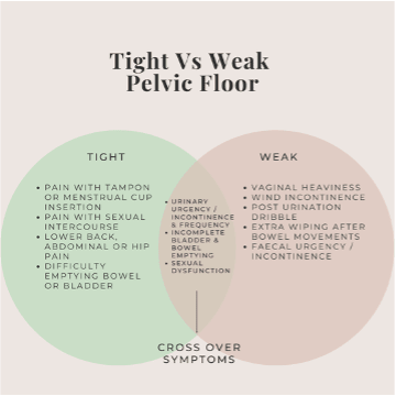 Tight and weak pelvic floor muscles can have crossover symptoms and we often see clients completing ‘Kegels’ (pelvic floor contractions) when, in fact, they have a tight pelvic floor and need to relax.