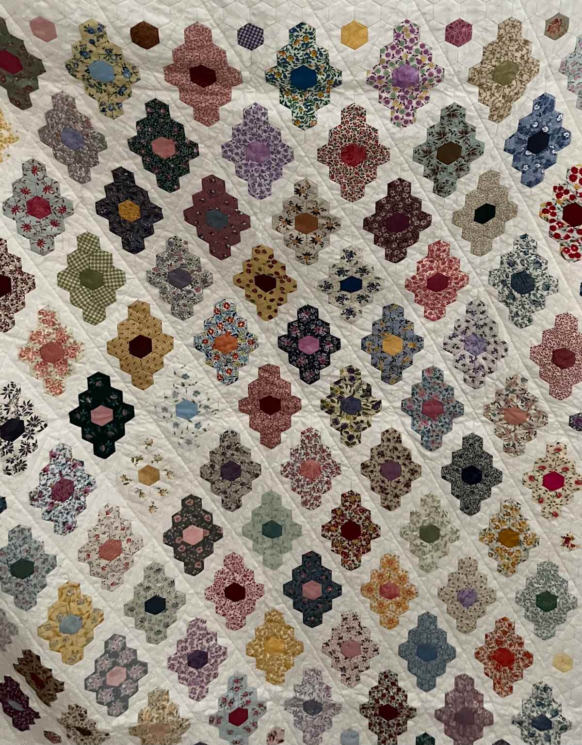“Occasionally I may use a machine for some work, but most often I work by hand, stitch by stitch, piece by piece to create the complications within a quilt pattern,” Gail says.