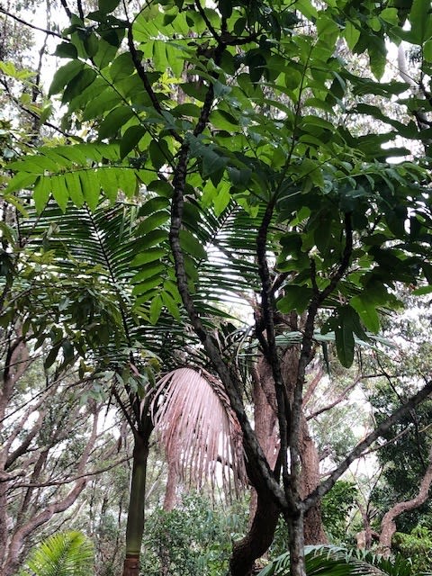 Pencil Cedar (Polyscias murrayi) has a large central stem about six metres long and with large pinnate leaves radiating from it, giving a kind of umbrella canopy. It can reach 30 metres and is easily to spot.