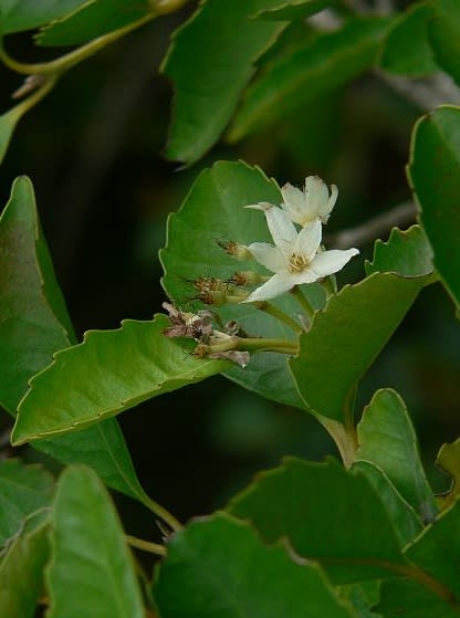 Sassafras is one of the most common rainforest trees of the Illawarra escarpment. It is only occasionally found on the coastal plain. It is a medium to large tree, reaching 30 metres. Its leaves are highly serrated and opposite, and highly aromatic if crushed. Its bark is light brown and sometimes grey, soft, flaky and tessellated. The white flowers are in clusters of three on short stalks, and they appear in July. The fruit is brown when ripe and has a short appendage for wind dispersal. It produces good wood for cabinet making. Two Sassafras were planted in the reserve in 2018 and are protected by a cage against the deer.