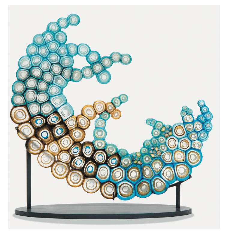 Nikki’s glass creations feel like detailed glimpses of life aquatic under a microscope, and leaves frozen in geological time. There’s a juxtaposition of ashen forms created out of actual carbon created by bushfires and colourful cells of glass that take on a coral reef form. The frozen leaves speak of leaves turned to ash, still keeping shape but so delicate.