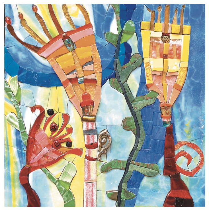 In a similar manner to the work of Margaret Preston, Susan’s work captures Australian botanica using the colour of fragmented leadlight glass, broken crockery and smalti (Italian hand-cut glass). While Preston used wood cuts that would create concave cuts, Susan’s art is in the convex, creating a texture that pushes out of the frame. They invite the hand to touch.