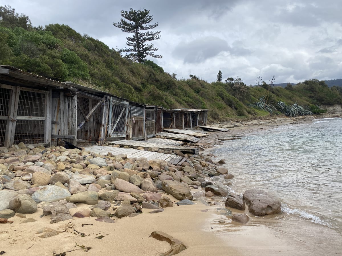 To the left of the carpark are a couple of picnic tables and toilets are located under the Sandon Point Surf Club. All along the walk are water stations for you to fill up your water bottle or your pooch’s bowl. Head down the concrete stairs to the rock platform for, without a doubt, the best rock pools in the Illawarra. The diversity here is incredible. Check for low tides here. Please note, the rock shelf is a ‘No Dogs Zone’. Look up and you may see the incredible white-bellied sea eagle circling overhead. To your left are the historic boat sheds, being in place for over 120 years which you can read about here.