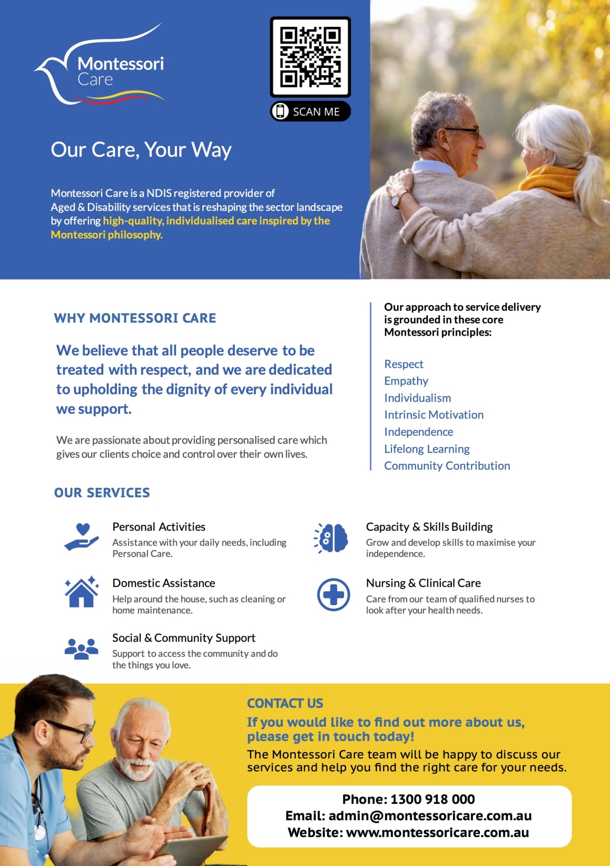 At Montessori Care, we breathe life into the Montessori legacy by infusing its principles into our in-home aged care and disability support services. Our journey began from a personal need – a quest for high-quality in-home care for our loved ones that felt like an uphill battle, with the process seeming daunting and convoluted.