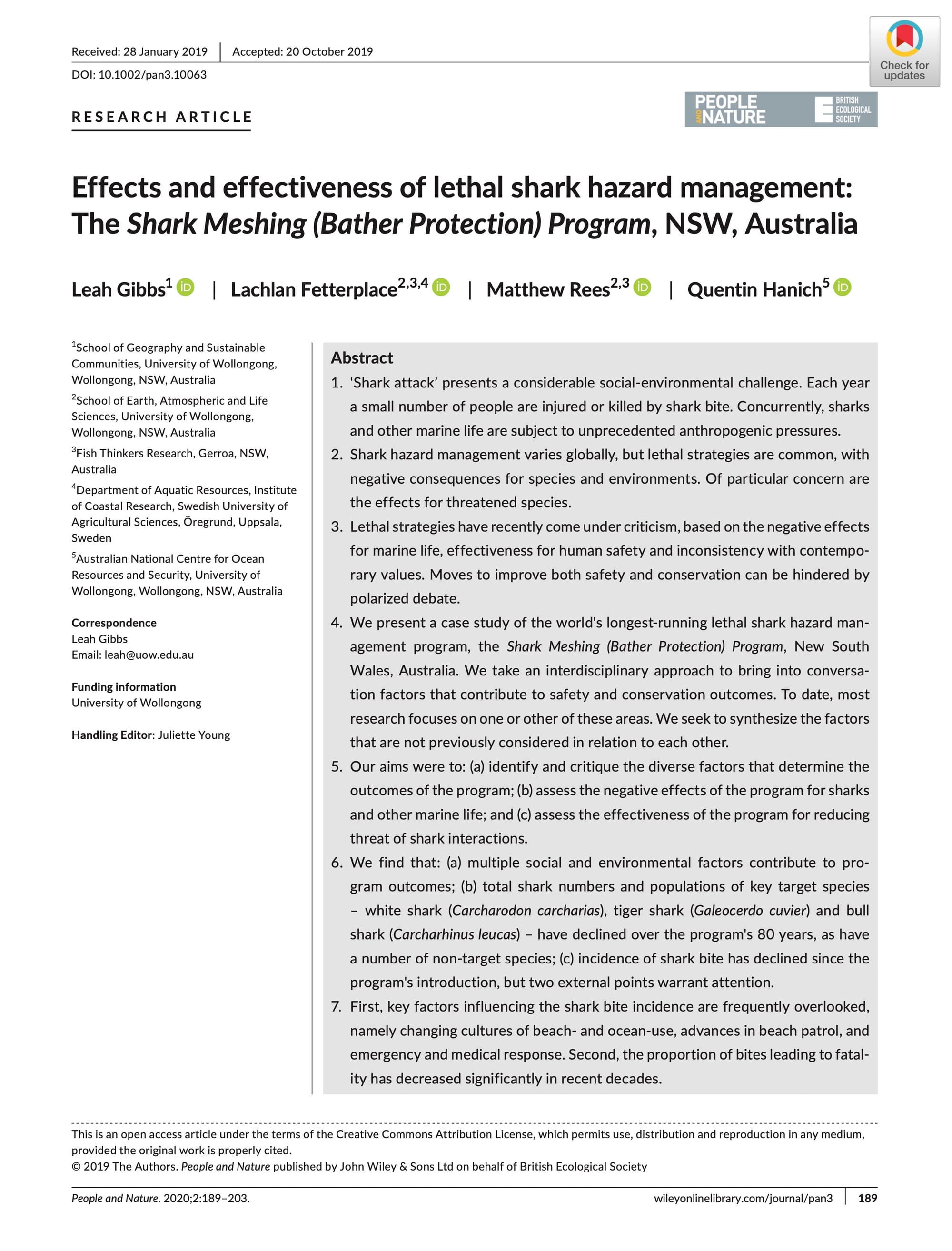 Dr Leah Gibbs is an author of a paper titled Effects and effectiveness of lethal shark hazard management: The Shark Meshing (Bather Protection) Program, NSW, Australia