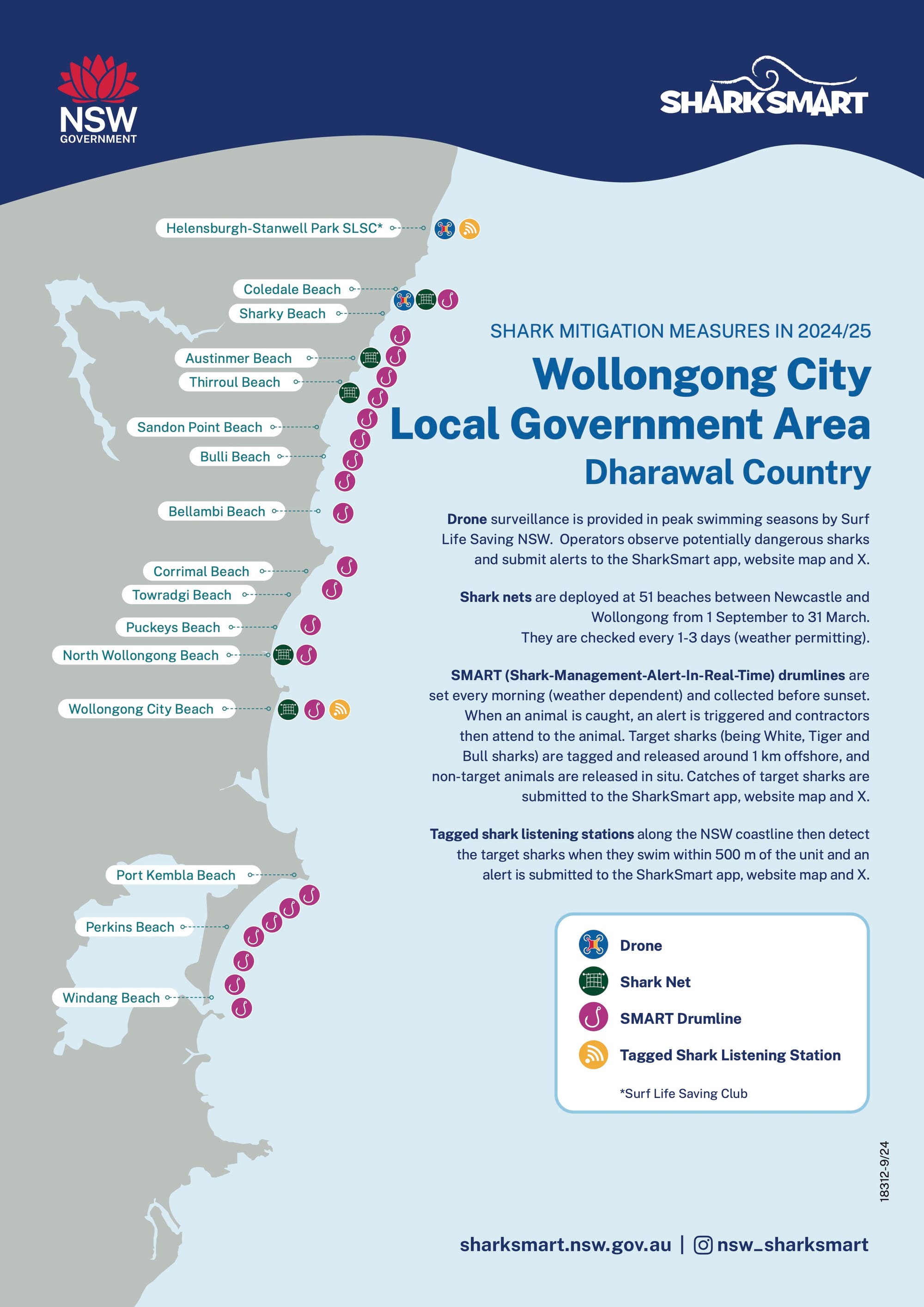 - Tracking the movements of tagged sharks via 37 tagged shark listening stations, including at Stanwell Park and Wollongong City Beach