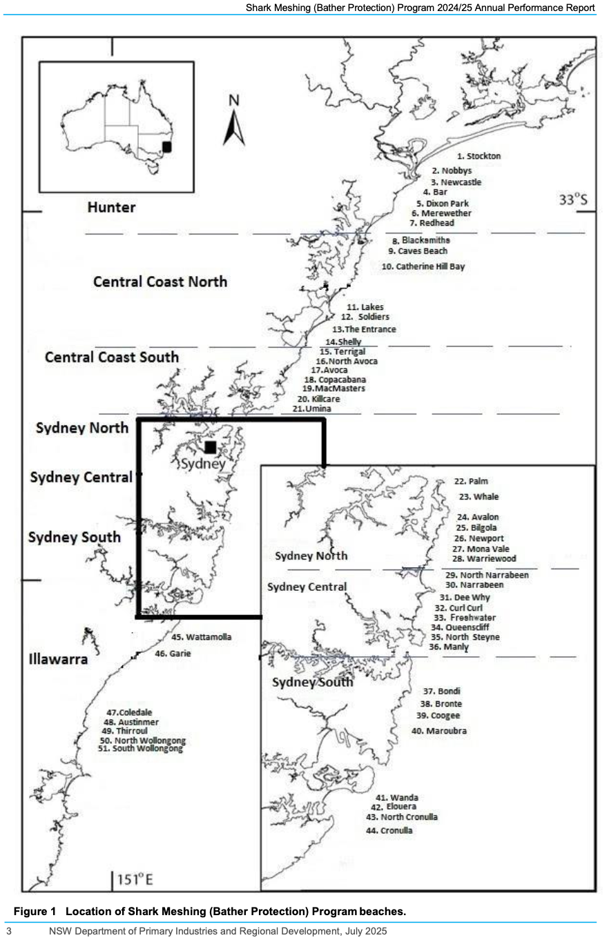 - Shark nets at 51 beaches between Newcastle and Wollongong, deployed 1 September to 31 March