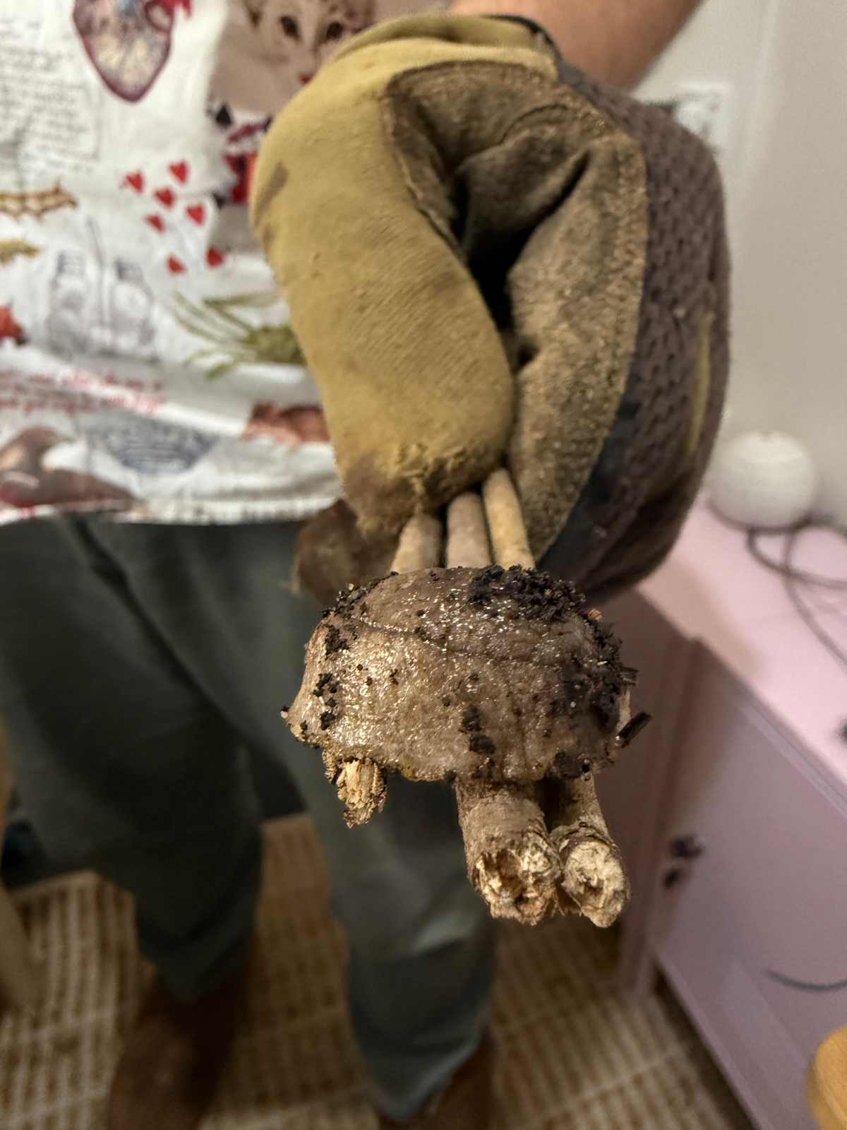 My husband walked inside, thick canvas gardening gloves on, tightly grasping several small sticks. He held the sticks out, as far away from himself as possible, and perched on top was a precariously balanced… something.