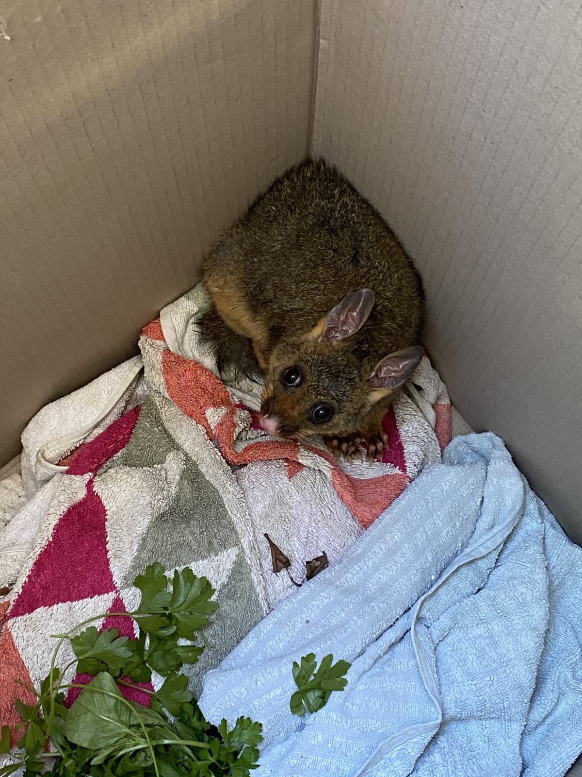 Normally at this point I'd say leave it to the experts. But I've worked with native animals including possums before so I felt up to the task and this fellow was already stressed and no doubt cold and terrified. A gentle nudge and he was in the box and letting everyone know about it! Thankfully, he had zero injuries and quickly nestled into the corner of the box where I added some banana then waited for dusk and the return of its mumma.